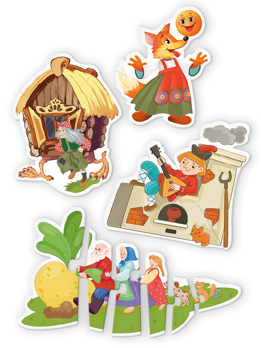 Набор содержит 4 фигурки, состоящие из 4–6 частей. Размеры собранных изображений: от 15 до 20 см.