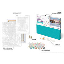 В набор входит: холст на подрамнике, акриловые краски в пронумерованных баночках, три кисти разного размера, инструкция с контрольным листом и эталоном готовой картины.
