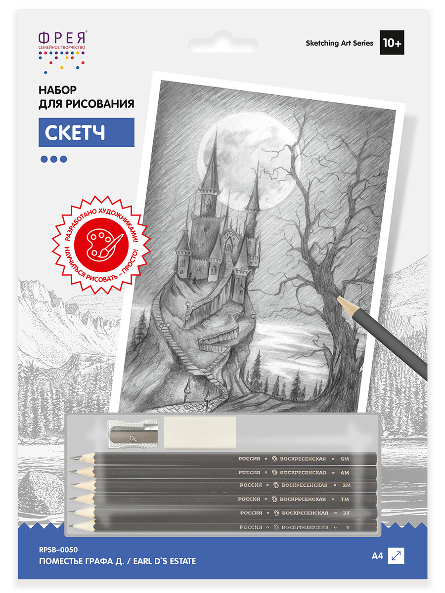 В набор входит: основа для рисования с напечатанными контурами, чернографитные карандаши, ластик, точилка, подробная инструкция с картинками, изображения этапов в масштабе 1:1